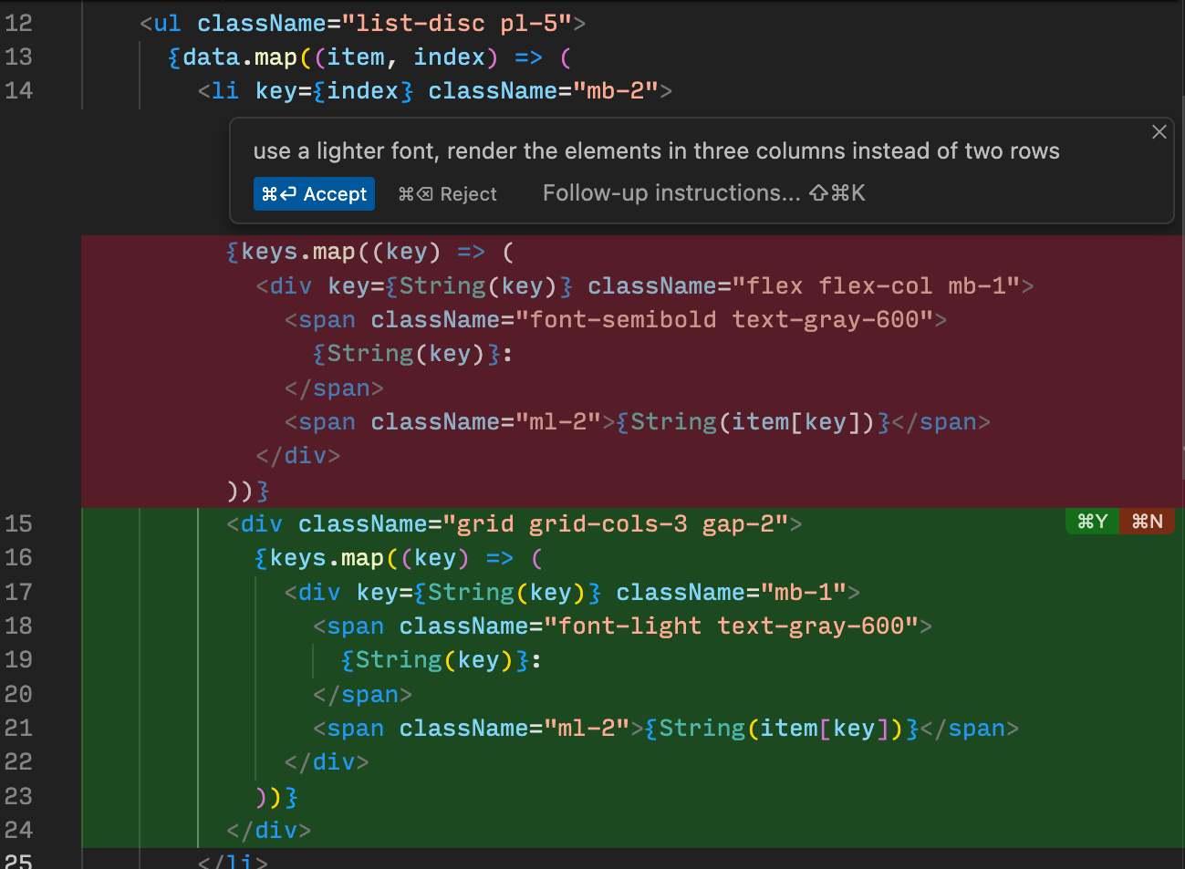 Hyödyllisin Cmd-K on ollut silloin, kun pitää kirjoittaa moduulin, luokan, tai funktion perusrakenne, tai tehdä ei-triviaalia koodia sellaisilla kirjastoilla, joita ei ole itse paljoa käyttänyt. Kielimalli arvaa oikean metodin noin 80-90% ajasta oikein, ja valmiista koodista on helpompi tarkistaa, että se tekee, mitä oli tarkoituskin. Tämä tapahtuu murto-osassa siitä ajasta, joka aiemmin meni pelkkään dokumentaation etsimiseen, lukemiseen ja soveltamiseen.
